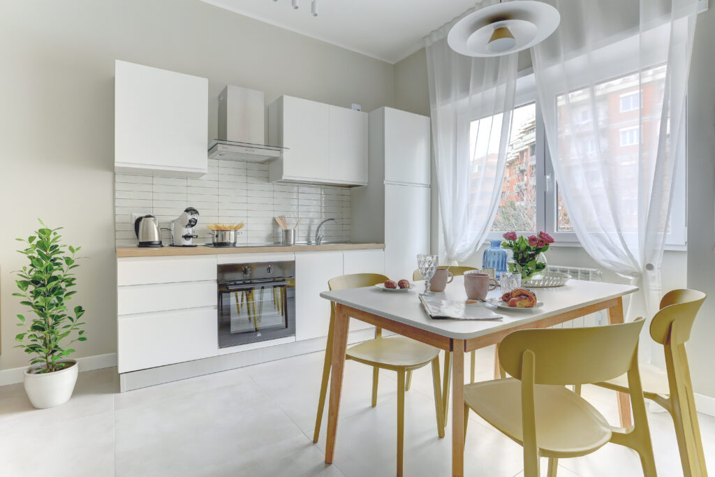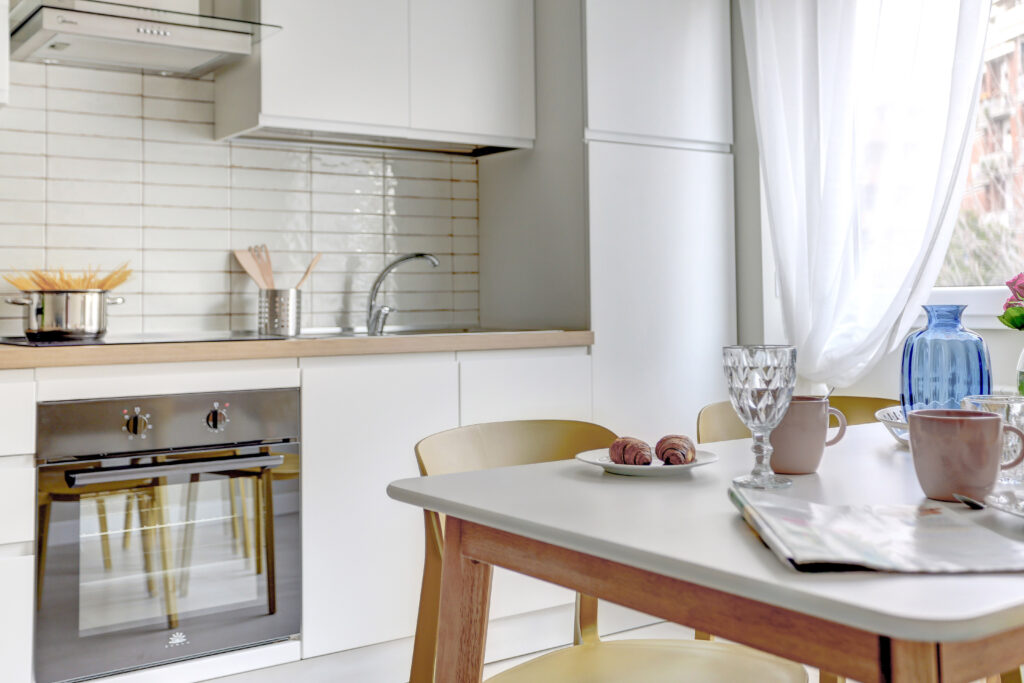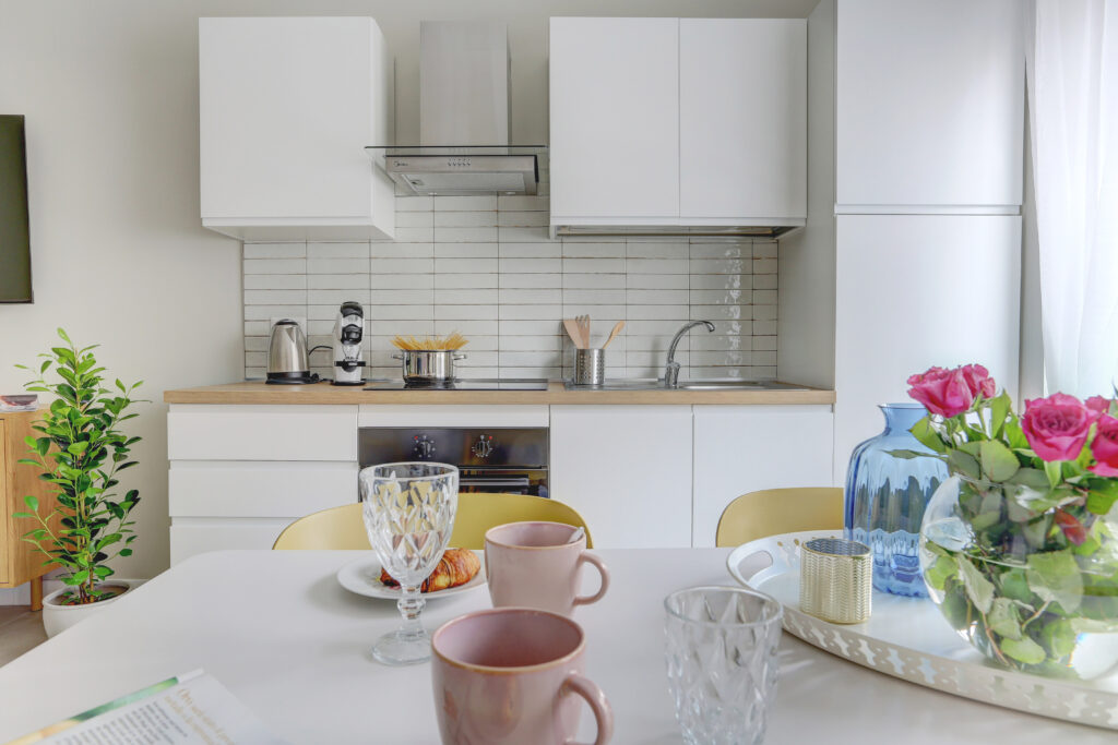La cucina è completamente attrezzata con lavatrice, microonde, forno, frigorifero e piano cottura a induzione — ideale anche per soggiorni più lunghi o per chi ama cucinare.